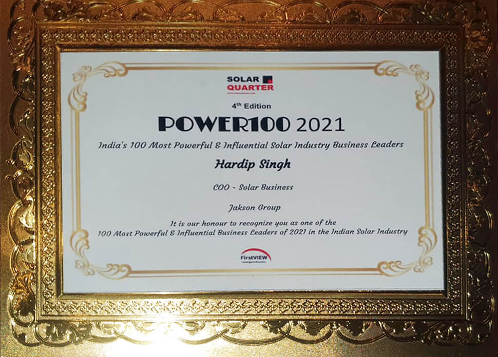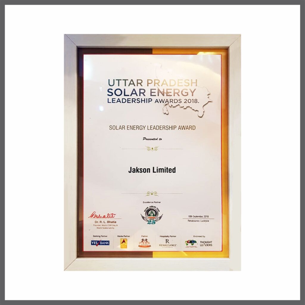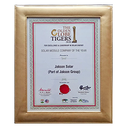 The Golden Globe Tigers for Excellence & Leadership 2020 In Solar Energy has recognized Jakson Group with the esteemed ‘Solar Module Company of the Year award. This accolade highlights the Solar Division’s exceptional design and engineering capabilities, manufacturing proficiency, and steadfast dedication to providing quality products and customer support.