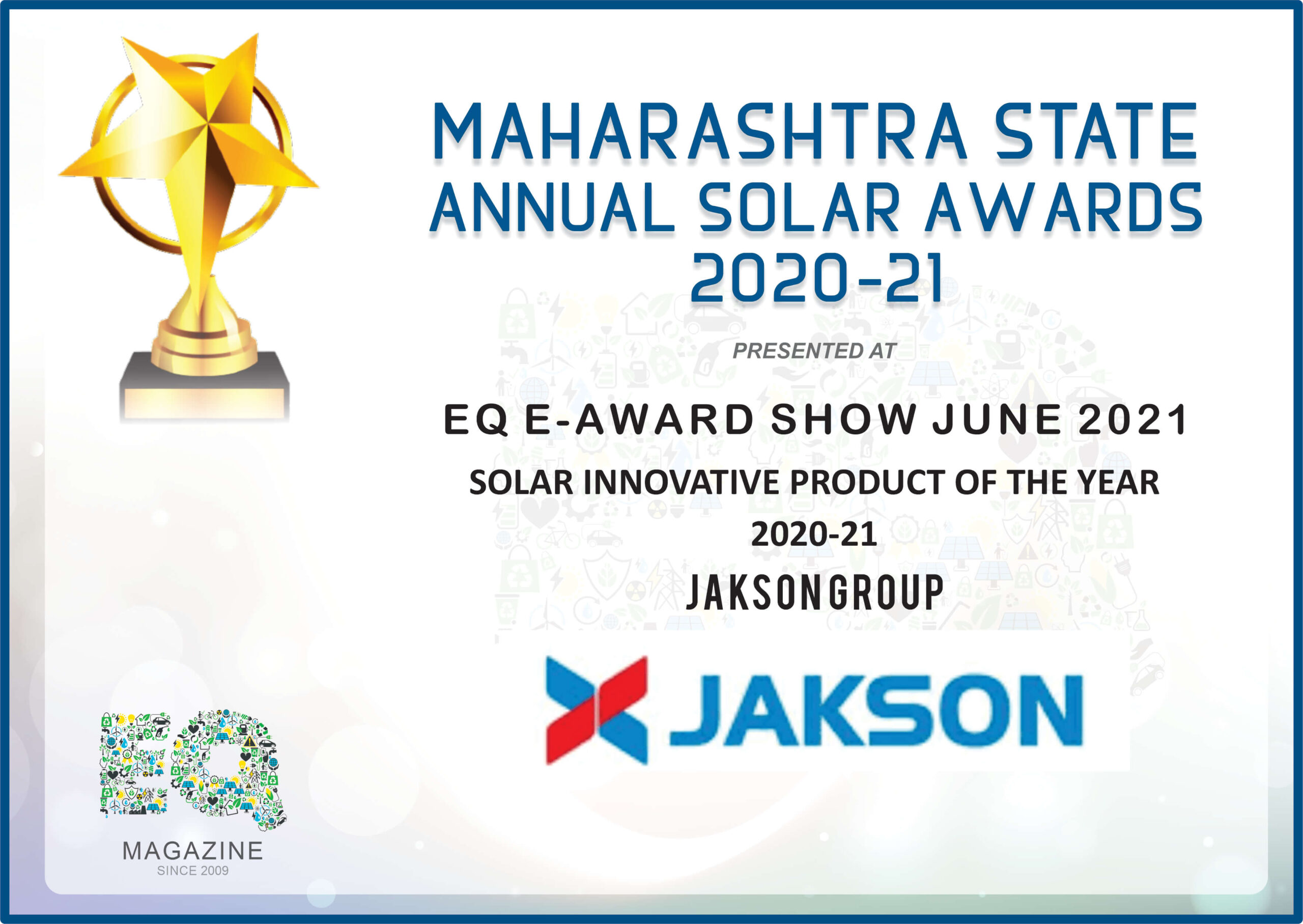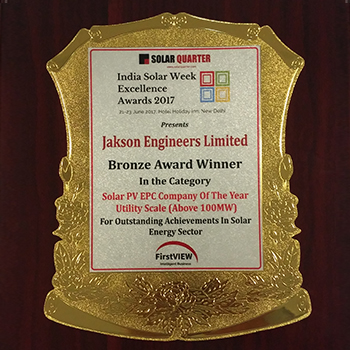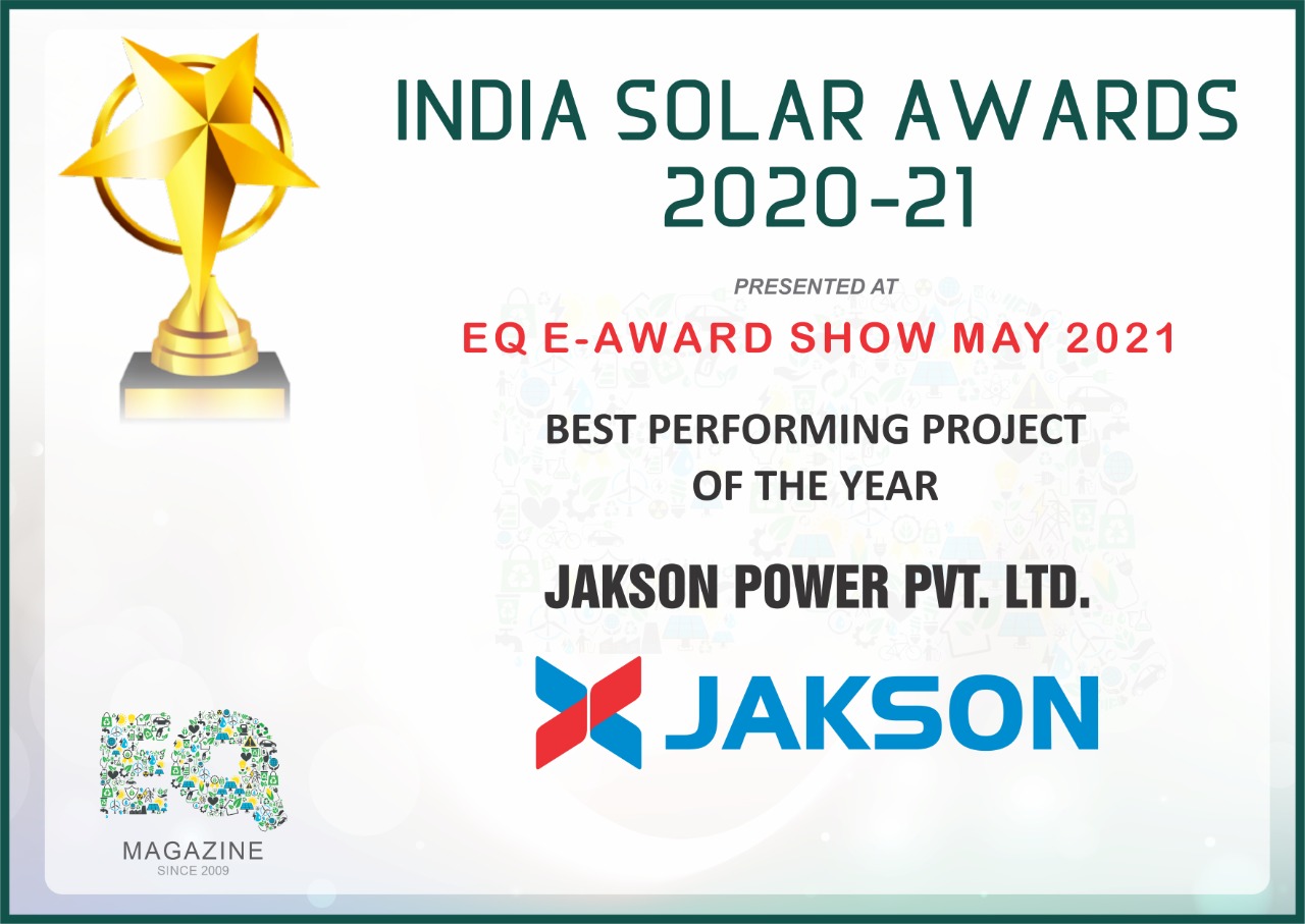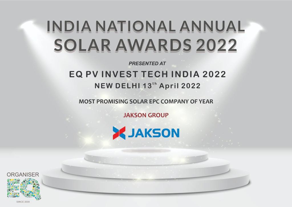 We are thrilled to announce that Jakson Group has been honored with the “Most Promising Solar EPC Company of the Year” award at the India National Annual Solar Awards 2022. This prestigious recognition was received by Mr. Jagannathan Shrikant, Head of Business Development International at our EPC Business Unit. We extend our heartfelt gratitude to EQ for acknowledging our efforts in the solar industry. This award motivates us to continue striving for excellence as we advance towards a sustainable future.