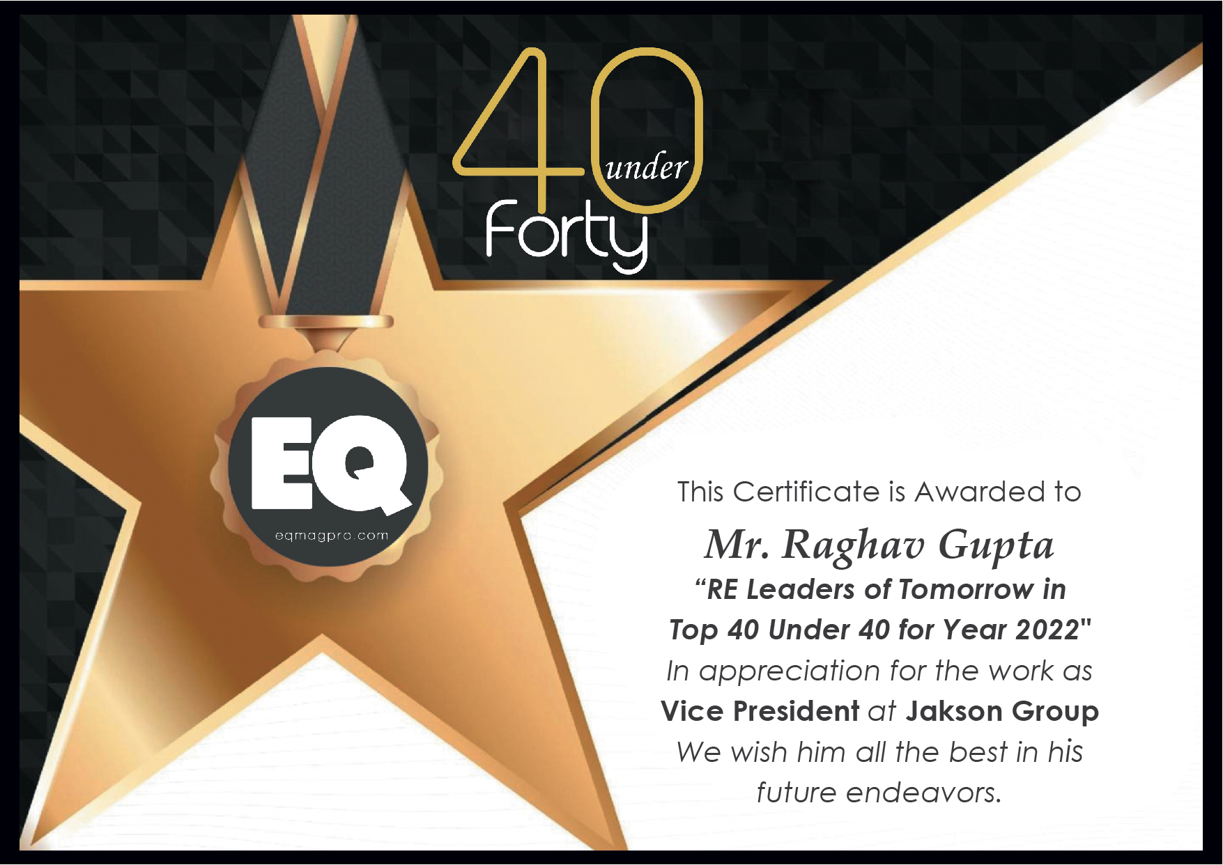 We are pleased to announce that Mr. Raghav Gupta, Vice President of Jakson Group, has been recognized as one of the recipients of the prestigious EQ Top 40 Under 40 award for the year 2022. This award is a testament to Mr. Gupta’s outstanding leadership and contributions to the organization. We congratulate him on this well-deserved honor.