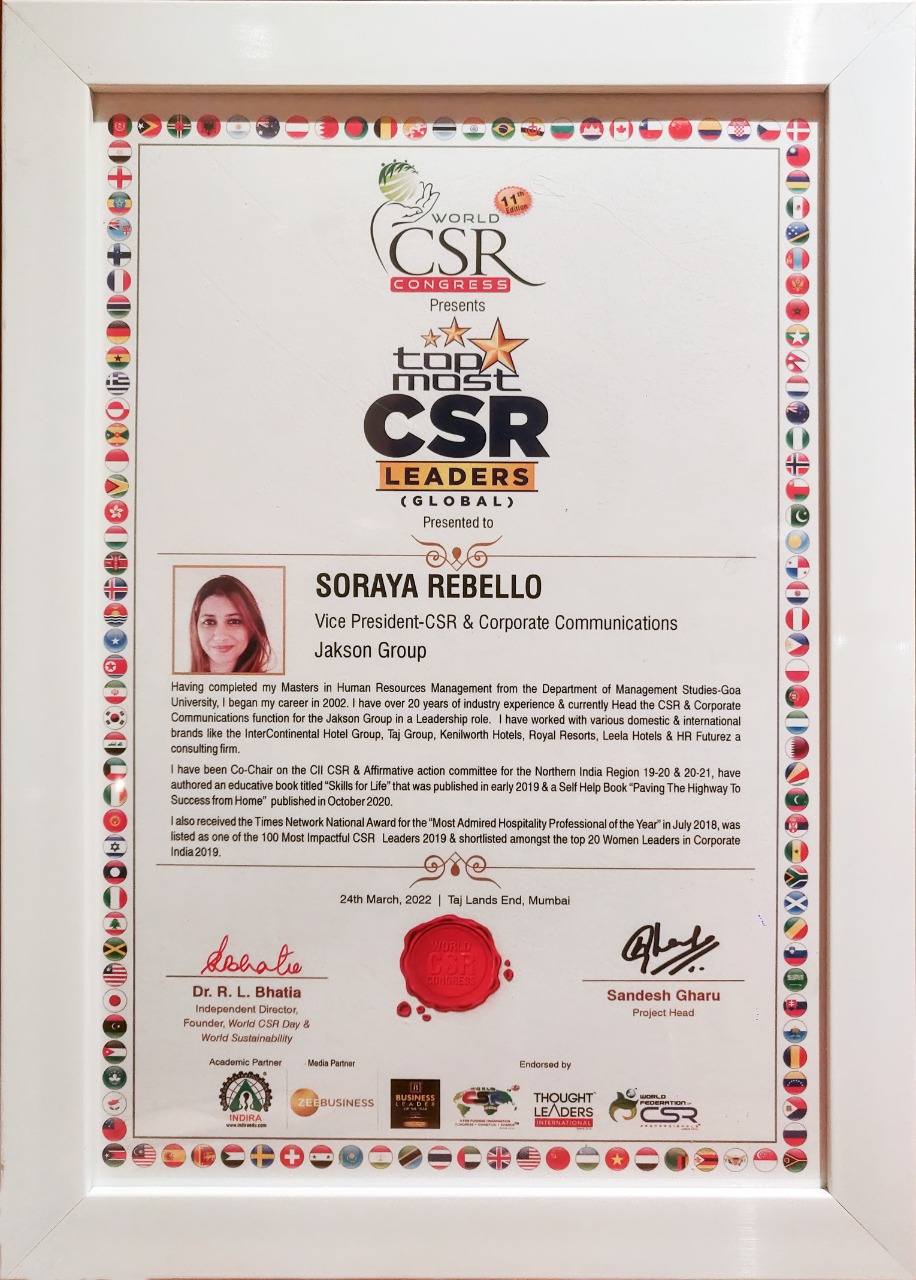 The World CSR Congress has recognized Ms Soraya Rebello, Vice President of CSR & Corporate Communications at Jakson Group, as the top CSR leader on a global scale.
