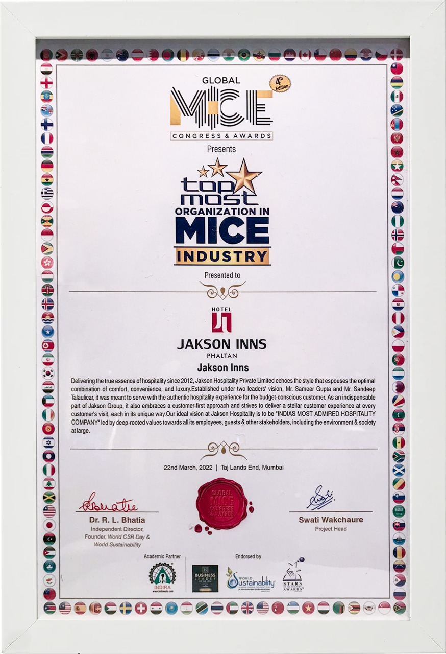 The Global Mice Congress Awards held at Taj Lands’ End Mumbai has recognized Jakson Inns, a unit of Jakson Hospitality, as the topmost organization in the MICE industry. This award is a testament to Jakson’s efforts in providing exceptional services in the Meetings, Incentives, Conferences, and Exhibitions (MICE) segment.