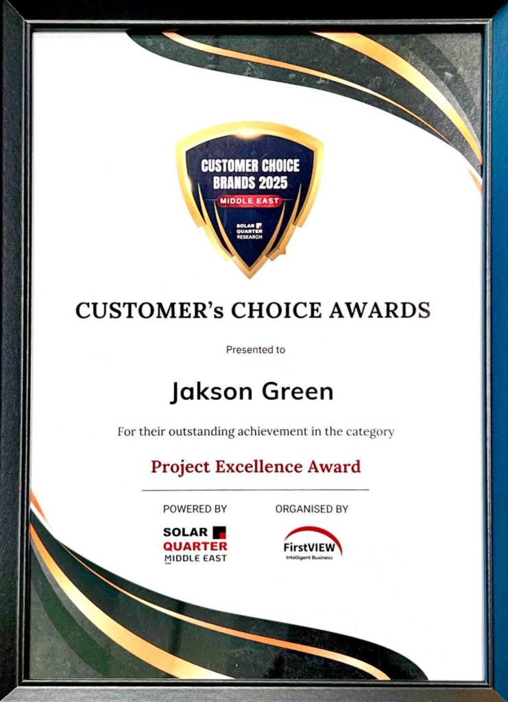 Jakson Green won Project Excellence Award for a 108 MWp Solar PV project in Saudi Arabia at the World Future Energy Summit 2025. The felicitation was done by H.E. Eng Nawal Alhanaee, Director of Future Energy Department, Ministry of Energy & Infrastructure – UAE, at the SQ Customer’s Choice Awards 2025 – Middle East. This recognition reinforces our stride towards expanding Jakson Green’s global presence in renewable energy, and further strengthens our commitment to advancing sustainable energy solutions!